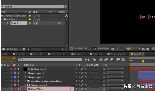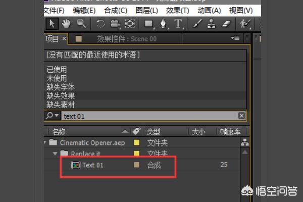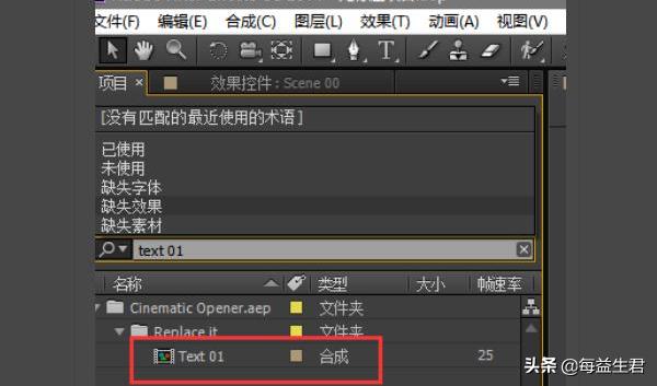 1、首先我们在项目窗口里面搜索合成“Text 01,找到之后双击点开。