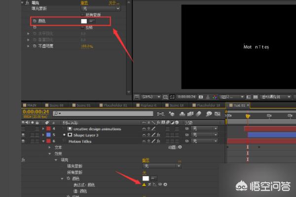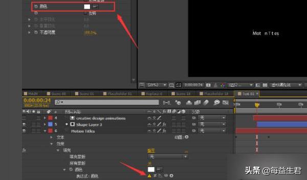 3、选中图层6之后,在效果控件里面双击颜色就会的打开表达式位置,或者选中图层连续按两下e键就可以打开表达式位置。可以看到在表达式颜色后面有一个小黄色的图标,那个就是代表这个表达式有问题。