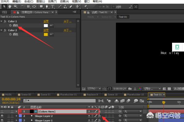 4、在这个合成里面找到名为”Colors Here“的图层的图层,找到之后在效果控件栏里面找到名为“Color 1”的效果,在这个效果下面有一个名为“颜色“的属性把表达式里面的英文改为”颜色“就可以了,或者可以直接选中表达式 从新链接到颜色上都可以。