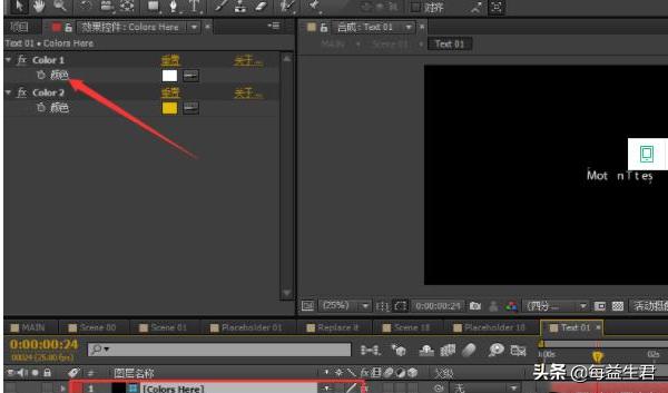 4、在这个合成里面找到名为”Colors Here“的图层的图层,找到之后在效果控件栏里面找到名为“Color 1”的效果,在这个效果下面有一个名为“颜色“的属性把表达式里面的英文改为”颜色“就可以了,或者可以直接选中表达式从新链接到颜色上都可以。