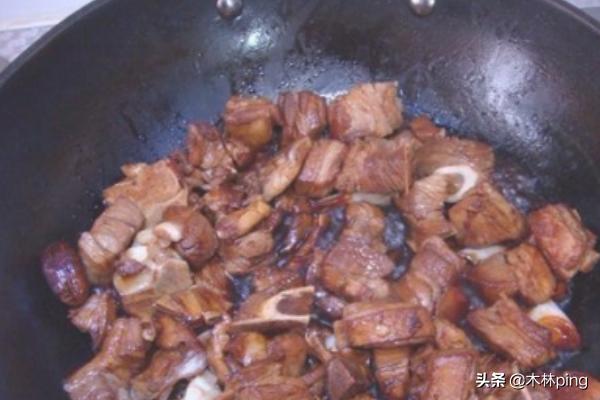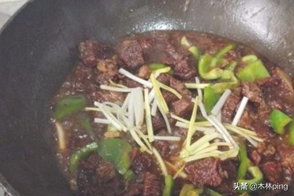 5、最后加入适量的盐和糖入味,大火收汁,加入青椒转中火翻炒至肉烂即可关火起锅装盘。