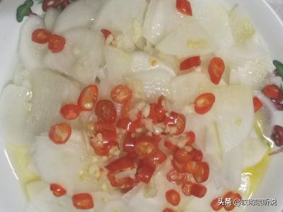 7、再把锅里加上食用油加热,把辣椒撒在白萝卜上面,再把烧好的油浇在上面,酸辣的腌制萝卜片就做好了。可以当零食吃,也可以当下饭菜吃。