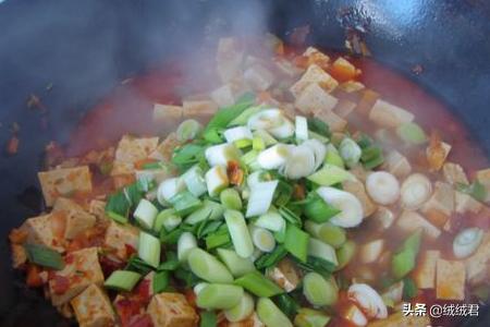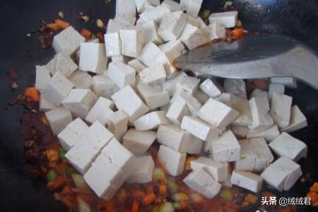 6、再放入豆腐翻炒均匀,因为豆瓣酱是咸的,就不需要放盐了;