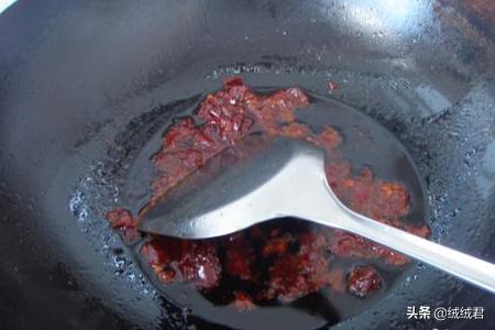 5、放入豆瓣酱炒出香味,再放入切好的胡萝卜丁翻炒几下;