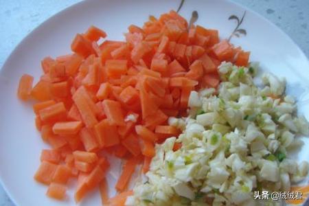 3、蒜切末,胡萝卜洗净切成小丁备用;