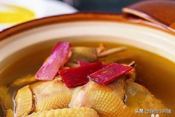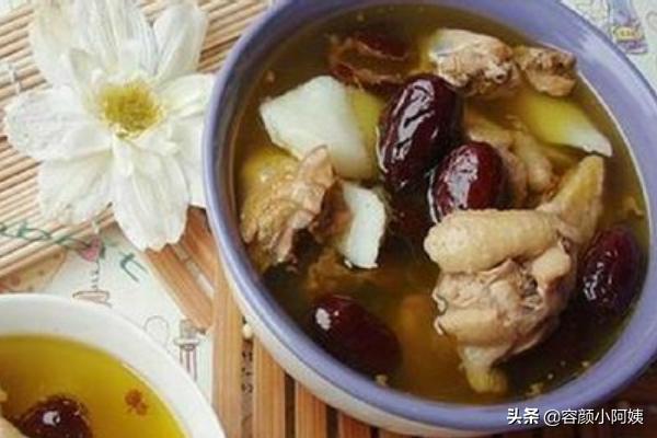 3、红枣山药鸡汤:鸡洗净剁小块,汆烫后捞出;红枣洗净,将鸡,山药、红枣放到紫砂电饭锅里煲6小时,最后放精盐、味精调味即可。