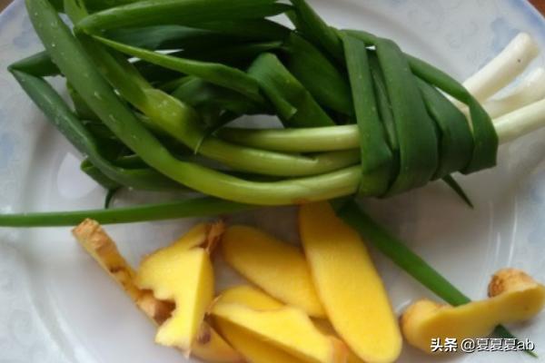 3、大葱理好洗净打成结,姜洗净后切成片。